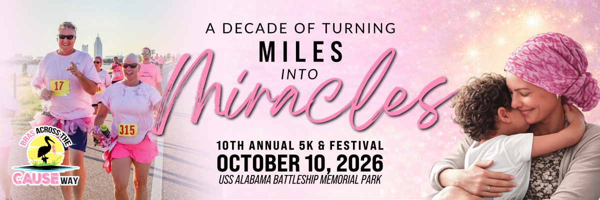 Join us for the 10th Annual Bras Across the CAUSEway 5K & Festival on October 10, 2026 at USS ALABAMA Battleship Memorial Park.