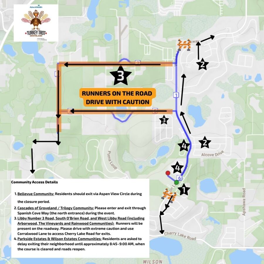 Thank you for helping us make this beloved Thanksgiving tradition a safe and enjoyable event for everyone! Below is important information regarding road closures and traffic flow during the AdventHealth Groveland Turkey Trot 5k & 10k presented by LiveTrends Design Group