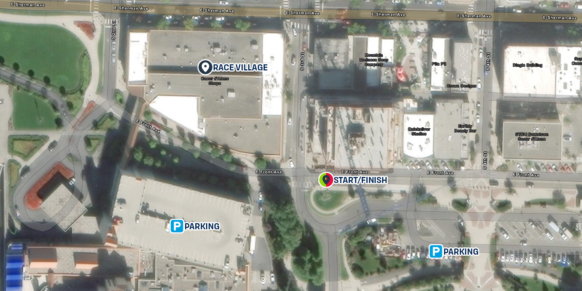Participant parking available at McEuen Park. Additional parking can be found in the surrounding downtown area and the Coeur d'Alene Resort parking garage.